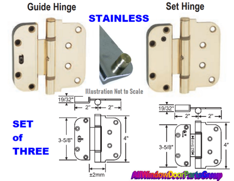 Adjustable Door Hinges, Stainless Steel Finish as Shown. Door Hinge Set of THREE (3) Adjustable Type, Vertical and Horizontal Adjustment - One(1) Set Hinge and Two (2) Guide Hunges. Left and Right-Handing, adjustments to change the reveal (gap between the door frame and the edge of the door).