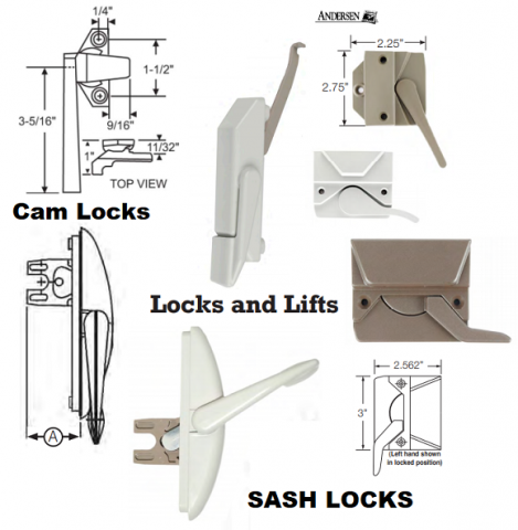 Cam Handles, Cam Projection Handles, Awning Window Handles, Window Sash Pull In / Push Out Locking / Latching Handles for use on projection style windows. The handle and keeper keeps window closed. Normally styled in Left or Right Handing Positions. Please Review The Pictures and youe will easily see the many types available, different hole to hole measurements, 1 3/8", 1 1/4", 1 1/2", 2", 2 1/2", and Numerous Handle Lengths 3", 3 1/2", 3 5/8", 3 3/4", or other [lengths] Normally some type of Die Cast Construction, Plastic Extruded, and available models in many finishes - Bronze, White, Aluminum, Chestnut Bronze, Black, Red, White Bronze, Medium Bronze, red-Bronze, Gray, Mill [Finishes] Cam handle locks are designed to provide long and trouble free service for many years by the strike design, latching type, inserts, tight lock technology, forced entry resistance, 90 Degree rotation, face mounted normally, unique combinations of lock / keeper, basement (hopper) window parts, Trim Line Series, High Strength Steel Keepers, Two Hole Handles, Wedgeless, Cam Operated Windows - PRICES VARY FROM MODEL TO MODEL AND START AS LOW AS $ 14.88 EACH