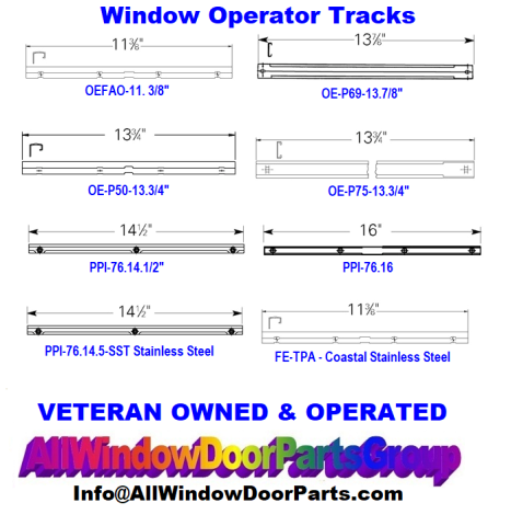 Casement Window Operator Track - Specify in the Comment Section - 11 3/8" or 13 3/4" Length as shown. For many casement style window brands, models and widths. The sash bottom track part, non-handed for your older model casement windows.