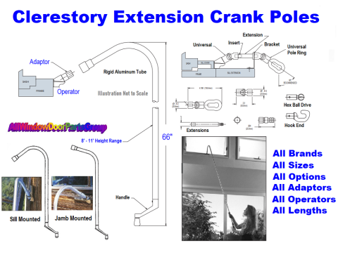 These rigid anodized aluminum poles feature free turning ABS hand grips - for operators located from 7' to 16' from the floor. Clerestory Poles and Crank Hardware. Clerestory Pole is used for reaching the crank handle for overhead awning window operators, clerestory windows and skylights.