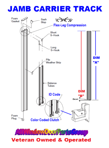 Window Jamb-Liner Pairs | Color Coded Clutch 50" to 60" Length - jamb liner pair, color coded clutch, White, Black, Blue or Brown, 50" to 60" overall long side length. Replacement Sash Track Assembly Carrier Complete with Balances.