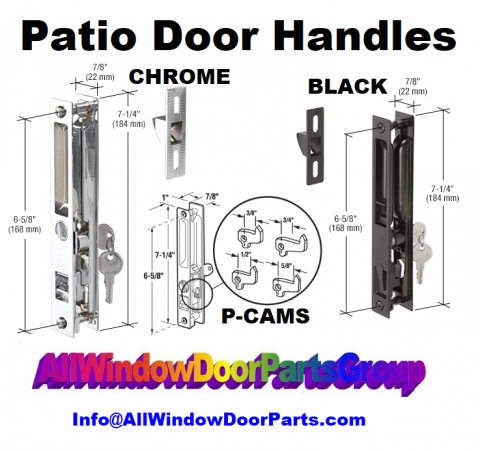 Guardian Glass Patio Door Keyed Handle | Flush Mount C29-PPRO-BLK, Flush Mounted Style, Guardian and Several Other Glass Patio Door Unit Replacements in Chrome, Black or White. Metal die cast construction with the four (4) cam reversible cams for all the various fit options. INCLUDES: One (1) inside latch and pull, (1) outside pull, (1) locking cylinder, (1) keeper, (1) 4-pc cam hook assortment and installation screws. PLEASE SEE DETAILS IN PICTURE - 6 5/8" C to C Screw Holes.