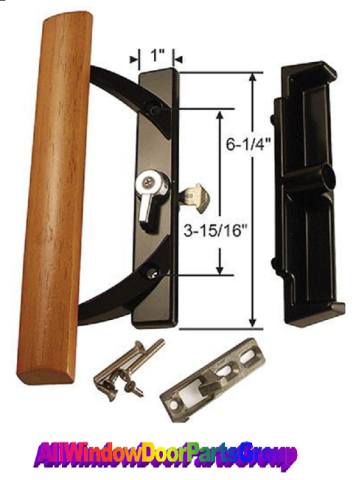 Guardian Patio Door Handle Set | Black with Wood Handle Set -  Sliding Glass Patio Door Replacement Handle Sets - As Shown in Picture and Details. Includes the latch bolt, keeper and screws. Reversible (right or left handing) openings, for 1" thick aluminum door, black painted finish. Handle as shown, internal lock, Hole Centers are 3 15/16" (C to C) - NOTE: Please confirm all details and measurements prior to ordering.