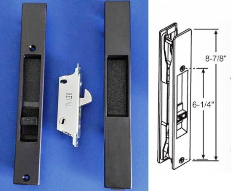 Patio Door handles and Locks for Guardian, PGT, WindDor, PPG Glass Patio Sliding Glass Doors:  Handle Set with Mortise | 8 7/8" OD. | Parts Item # PO-OLP, Item Description:  Patio Door Handle, Black - for sliding glass patio doors, flush mounted design; Non Keyed; Patio door replacement parts and handles;