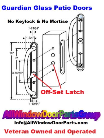 Deluxe White Sliding Patio Door Locking Handle Sets for old Guardian Glass Door - Deluxe Sliding Patio Door Handle Set in White Please review all details before ordering. Key-Lock and Keyway and Keys are Included. "FOR OFFSET LATCH" (it is not centered). 3 15/16" Center-to-Center - No Mortise Lock or Keeper is included.