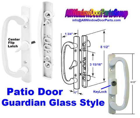 Guardian Tempered Glass Sliding Patio Door Style Replacement Handle Sets as Shown - With Centered Latch Assembly (Not Off-Set) - This Replacement Set is as follows: (1) NO KEY AND NO KEYWAY ASSEMBLY, (2) New Mortise Lock Is Not Included. Model # GS-PD-CL/WHT, Unit Assembly in White. NOTE: Unit is also available in Black, however If you want Black you must specify in the "Comment Section" at Checkout. IF NOT SPECIFIED, WE WILL SHIP WHITE.