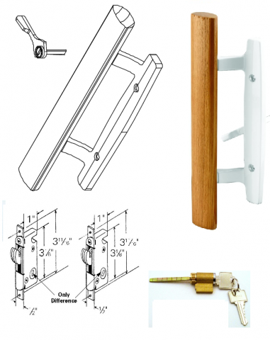 WHITE HANDLE SET AS SHOWN - NO KEY LOCK - NO MORTISE SET - Sliding Patio Glass Doors With Guardian Tempered Glass Stampings Have Used Several Styles of Handles, Latches, Locking Handle Sets and handle Options Over The Years .. Some are interchangeable and Some Are Not - This Model (as shown ) fits several models so be sure to look at any and all measurements before ordering. f you are not sure, please send us some good clear pictures of the INSIDE AND OUTSIDE HANDLES. Installation holes 3 15/16" on center; Mortise Lock Type Unit; Mortise lock NOT INCLUDED; Deluxe wood handle set comes complete with inside and outside pulls and screws; WHITE FINISH.