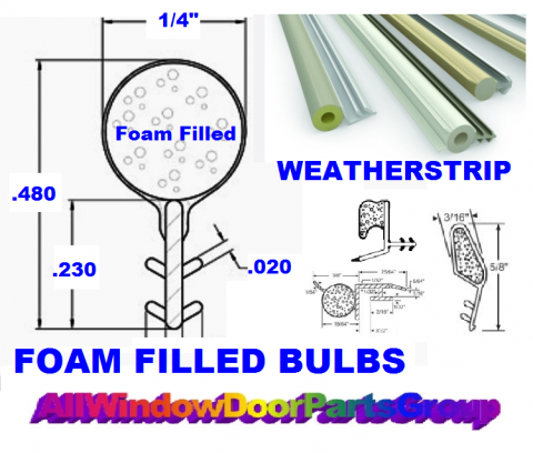 Over the years many older foam filled weathertrip parts and seals have changed to hollow bulb type seals; Buying your weatherstripping for doors and windows online is easy if you're dealing with the pros at Biltbest Window Parts DIV. of AllWindowDoorParts GROUPUSA! Volume discounts for large volume 500' Rolls available; FREE PARTS ID and HELP ONLINE -- foam filled weatherstrip, kerf weathserstrip, hollow core foam seals, bubble seals as well. 1/4" inch diameter, foam filled window "kerf slot" sash and frame weatherstrip [WHITE] Also available elsewhere on this site in smaller rolls , 50' and 25' - and you won't find this at your Home Depot, Lowes or Ace hardwqare stores.