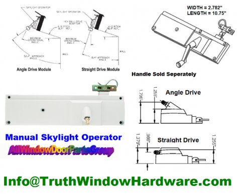 Manual skylight control operator system, Angle Drive # OT-OFR-AD and the Straight Drive # OT-OFI-SD - both units are is easy to install and replace older units and is compatible with wood, metal or vinyl framed skylights; Replaces some ROTO Skylight, older versions. The special high gear reduction provides for the low torque needed to lift a sash weight of up to 140 lbs. with minimum effort. The steel chain is detachable at the sash for easy maintenance. HEX BALL ADAPTER INCLUDED. Handle Sold Seperately.