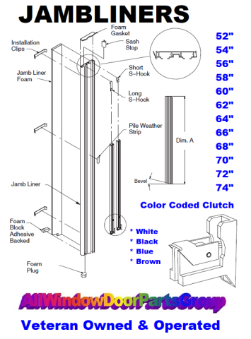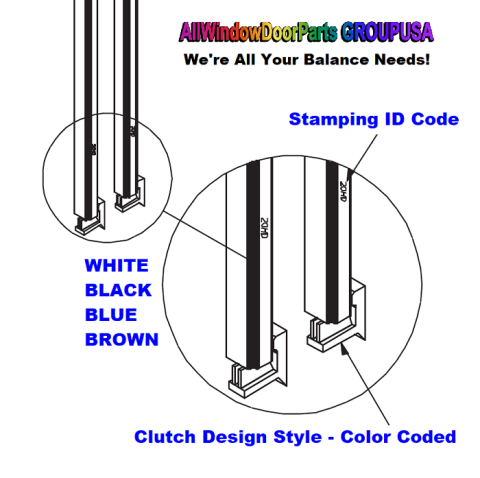 Double Hung, Tilt-Pac Jamb Liner Pairs with the Color-Coded Clutch (as shown) - 64" - 70" Length in White or Beige. Color Coded Clutch Style, as per illustrations below. Flange mounted jamb hardware includes fuzzy pile seals, foam plug, gaskets and sash stop. Flange mounted jamb-liners with compression extruded flex legs [see illustration] are completely interchangeable with jamb-liners manufactured after April 1986 to present / E−Z Tilt only, and for units manufactured before April of 1986 (that utilize the clip mounting system).