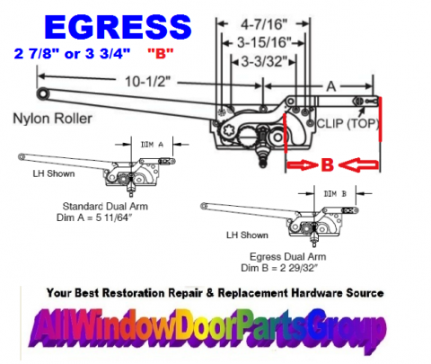 NORCO WINDOW PARTS - Wood / Clad Casement Window Hardware - Old Style Nor-Clad Egress Casement Window Operator Replacement Part NC-FPII - Left or Right Handing Available -- SEE PICTURE -- YOU MUST SPECIFY "handing" and "B" Length in the COMMENT SECTION at Checkout .. - This is the new OEM replacement model for the OLD STYLE NORCO CASEMENT OPERATOR used for many years. ( please see pictures ) These are Special Order Units, Please be sure of the "handing" ( look at pictures ) Normally these are used with the removable or hidden sill stop wood cover. HANDING: SEE PICTURES