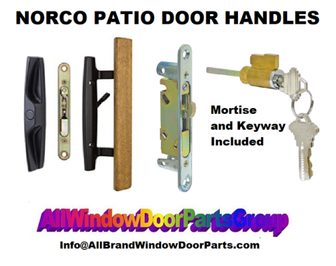 Norco Patio Door Handle Set - Inside Wood Handle, Outside With Keyway and Key Lock Assembly and New Mortise. Norco Patio Door  Handle Set with centered latch and keyway AS SHOWN BELOW - Mortise Lock and Cylinder Included. Available in Bronze, White, Beige, Black, Almond - PLEASE REVIEW ALL DIAGRAMS AND PICTURES AND MEASUREMENTS BEFORE ORDERING.