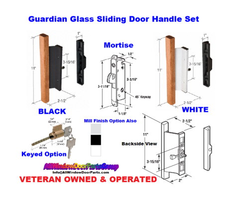 Old Style Guardian Sliding Glass Patio Door Wood Handle Set in White, Black or Mill Finish - WITH MORTISE LOCK ASSEMBLY. This style fits a number of old Guardian Tempered Glass Sliding Patio Doors. Please review all before ordering. Wood Handle unit available in white, black or mill finish inside with blade handle exterior as shown. Specify Color in Comment Section at Checkout - if no color is specified, we will Ship BLACK.