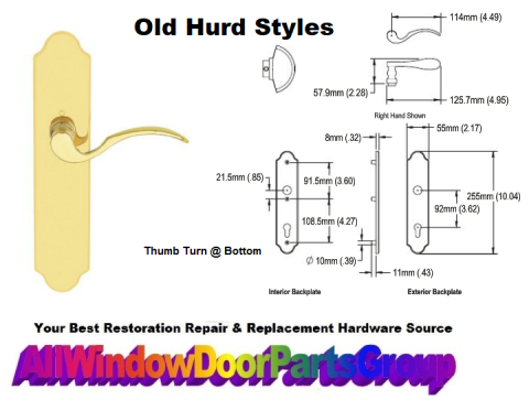 Old Style Hurd Active Panel French Door Replacement Handle Sets - with the Bottom Lock and Thumb-Turn. Basic style as shown with the 2.17" Wide X 10.04" Faceplate Style and Handle as Shown in diagram for 1 3/4" thickness of doors. Available finishes are limited so please specify finish desired in the comment section at checkout - Bright Brass , White or Matte Black.