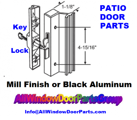 Patio Door Replacement Parts - Handle Set - with Key Lock - this Fit All Keeper, and Handle Set - With Key Lock. Patio Door Replacement Part. Aluminum Mill Finish or Black - for Sliding Patio Doors - Guardian, PPG, PGT, Herculite, Caradco and others. Patio Door Handle Set for sliding patio doors as shown in the picture schematic - 7 3/8" with 4 5/16" C-C Hole Spacing. Handle can be set for OX or XO Opening - Model # POPIR-Mill or also available in Black - Color, WITH KEY LOCK INCLUDED. (Unit Is Available without keylock elsewhere on site)