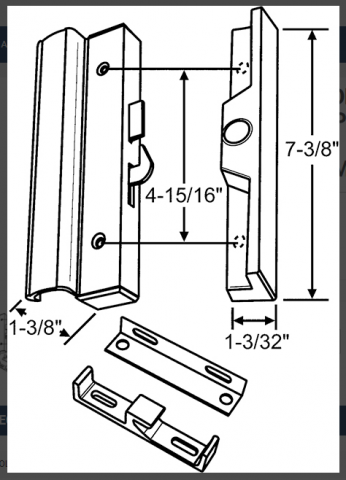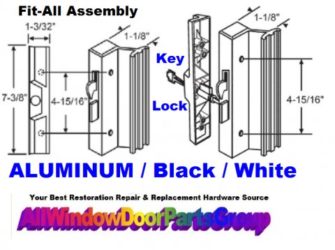 Patio Door Replacement Parts - Handle Set | Fit All Keeper and Handle Set - Aluminum Mill Finish or Black Aluminum Style for Sliding Patio Doors - Guardian, PPG, PGT, Herculite, Caradco and others. Patio Door Handle Set for sliding patio doors as shown in the picture schematic - 7 3/8" with 4 5/16" C-C Hole Spacing. Handle can be set for OX or XO Opening - Model # POPIR-Mill or also available in Black - Color, NO KEY LOCK INCLUDED. (Unit Is Available with Keylock Elsewhere On This Site)
