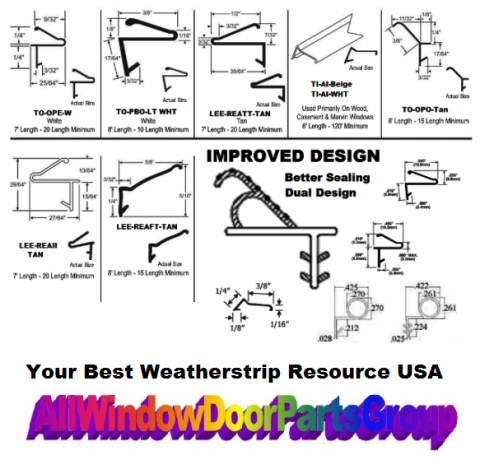 Crestline Patio Door and Window Weather Strip Replacement Parts - Leaf Type Flap Leaf Seals and Weather Strip solutions for doors / casement / awning style older units. Several types and styles were used as shown below -- PLEASE SEE BELOW FOR OPTIONS .. lengths, colors and minimum orders as outlined.
