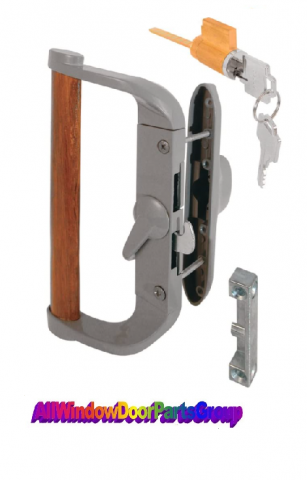 Sliding Patio Door Replacement Parts | Pull Assembly With Keylock - AS SHOWN BELOW - Sliding Door Handle Set, Keyed, Aluminum and Diecast Composition AS SHOWN. Finished in Aluminum / Wood, surface mounted patio door handle. Metal is Aluminum and an alloy steel with a two way diecast strike keeper. We're All Your Sliding Patio Door Needs! PGT, Sullivan Ind. , PPG, Guardian, Caradco and others - serving the homeowner with window, door, and hurricane engineered hardware for those brtal storms in Florida, Dade County, Georgia and the Caribbean - top notch, high quality products and service nationwide. You can look to the AllWindowDoorParts GROUP USA for all your sliding glass patio door needs, motise locks, roller and wheel assemblies, impact hardware, replacement door handles, patio door keylocks, single and double mortise locks and so much more.