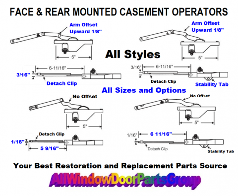 Casement Window Old Style Crank Operators | Front or Rear Screw Mountings | Truth Dyad Styles Some As Shown Below. Truth and EntryGard Old Dyad Styles with various arm lengths, offsets, stability tabs, links and detach clips as shown. These featured the die-cast metal body housing and steel arms. Please note all the variations and measurements of various items as shown. Stud brackets and crank handles are sold separately. [Truth EntryGard Stampings] 20544, 30636, 30637, 40352, 30905, 31401, 31876, 5 Digit Codes, 30471, 45275, 55064, 55063, 20810, S1068, Straight and Offset Links, 30905, 45251, 30636, 20810A, 20544, 30866, 30614, 30593, 30615, 30894.