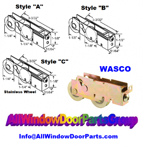 Wasco Patio Door Replacement Parts - Adjustable Roller Assemblies, Handle Sets and more. Wasco Rolling Sliding Patio Door Replacement Parts | Tandem Style Roller WASCO was out of Sanford, Maine and no longer makes sliding glass patio doors. Doors may have Guardian Tempered Glass, PPG or Herculite glass product stampings. Also available in Stainless Steel Versions. Customers search for Wasco European Patio Doors, Wasco sliding doors, Wasco rolling screen doors, Wasco sliding door locking handle sets, rolling patio door replacement parts etc.