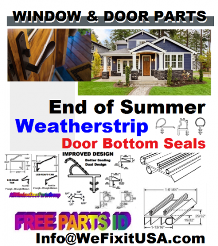 All Window and All Door Replacement, Repair and Maintenance Service Parts from the AllWindowDoorParts Group, USA and Nationwide: Service and Replacement Hardware for All Brands of Windows and Doors, All Styles and Types of windows, patio doors, inswing and outswing doors, parts, hardware, weatherstrip, weatherstripping, weatherseals, vinyl replacement parts, OBSOLETE WEATHERSTRIP OF ALL TYPES - Window and Door "snap-in" Glazing Bead, Foam-Filled Weather Strip, sash and frame weather strip for casement and awning windows, single and double hung windows, sliders and gliders - hardware, operators, cranks, handles, covers, lifts, locks, latches, sash locks, balances and jambliners, roto-gear operators, hinges .. Entry Door and Patio Door Seals .. Bug Flaps .. Door Bottom Sweeps & Threshold Seals .. Wool Pile weather seals - WE"RE ALL YOUR WINDOW AND DOOR PARTS NEEDS!